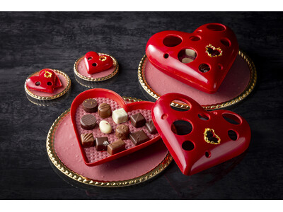 「ビジューハート」は、直径約20cmのLサイズと約6.5cmのSサイズで展開する艶やかな深紅のハート型ショコラ。ハート部分にはフェルクリン社のオーパスホワイト35%、ベースにはバリーカレボー社のルビーチョコレートを組み合わせ、まろやかなコクとルビーならではのフルーティーな酸味がふわりと広がる味わいに仕立てました。ハートの隙間から顔を覗かせるボンボンショコラと金粉のきらめきが、特別なギフトにふさわしい華やかさを添えます。