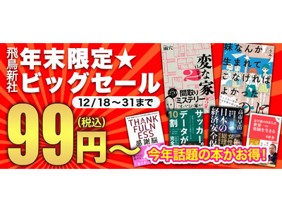 株式会社飛鳥新社(本社:東京都千代田区一ツ橋、代表取締役社長:土井尚久)は、12月の電子書籍キャンペーンとして「飛鳥新社 年末限定★ビッグセール 今年話題の本がお得! 99円(税込)~」を実施いたします。