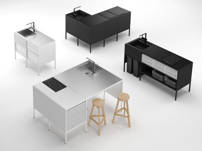 「生活の基本となる本当に必要なものを、本当に必要なかたちでつくる」という、無印良品のものづくりの基本をキッチン開発においても実践しました。スチールパイプとスチールパネルでフレームを組み、ステンレスの天板を乗せた単素材、単純部材でつくったモジュール型キッチンです。流し台・調理台・コンロ台等の独立したパーツを組み合わせて構成するモジュール型キッチンを採用することで、無駄をそぎ落とし必要な機能だけに絞ることができるほか、部材を交換しながら永く使うことが可能になりました。シンプルな構造でハイカウンターとしての機能も兼ね備え、ユニットを連結することで大型のキッチンカウンターがつくれるため、住宅だけでなくオフィスラウンジ・コミュニケーションエリアの空間づくりにもおすすめです。