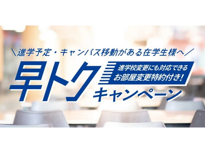 株式会社レオパレス21(東京都中野区 代表取締役社長:宮尾 文也、以下「当社」)は、新生活を迎える学生の皆様を応援する取り組みとして、「早トクキャンペーン」を本年度も継続実施することといたしましたので、お知らせいたします。