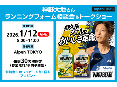 スポーツ用品販売の株式会社アルペン(本社:愛知県名古屋市、代表取締役社長:水野 敦之)は、「スプーン印」「ばら印」でおなじみのDM三井製糖株式会社(本社:東京都港区、代表取締役社長CEO:森本 卓)およびグループ会社の株式会社YOUR MEAL(代表取締役CEO:須藤 大輔)と協力し、持続性エネルギー源「パラチノース(R)」を配合したエナジージェル「WARABEAT!!(ワラビート)」の体験型イベントを、2026年1月12日(月・祝)にAlpen TOKYO(アルペントーキョー)で無料開催いたします。