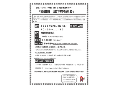慶長14年(1609年)、姫路藩主池田輝政によって、播磨52万石を支配する拠点として築城された現在の姫路城。姫路はその城下町として整備されましたが、時代の移り変わりの中で、大きく様変わりしてしまいました。そこで今回のセミナーでは、城郭研究室の職員とともに往時の姫路城下町をたどる見学会を開催します。
