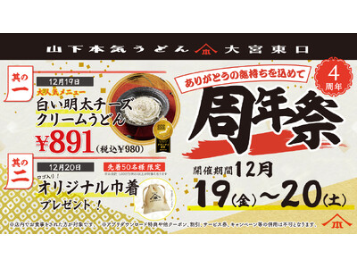 株式会社ガーデン(本社:東京都新宿区 代表取締役社長:川島賢 以下「当社」) が運営する、「山下本気うどん大宮東口」は、2025年12月20日(土)にオープン4周年を迎えます。ご愛顧くださるお客様への感謝の気持ちを込めて、「山下本気うどん 大宮東口」にご来店いただいたお客様を対象とした「周年祭」を2025年12月19日(金)・20日(土)の2日間限定で開催いたします。