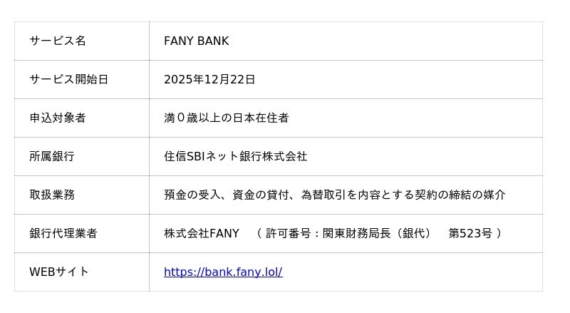 住信SBIネット銀行株式会社(本社:東京都港区、代表取締役社長(CEO):円山 法昭、以下「住信SBIネット銀行」)は、吉本興業グループの株式会社FANY(本社:東京都新宿区、代表取締役社長:梁 弘一、以下「FANY」)と住信SBIネット銀行が提供するフルバンキングBaaSを活用した新たな金融サービス「FANY BANK(ファニーバンク)」を2025年12月22日(月) 10:00より提供開始します。