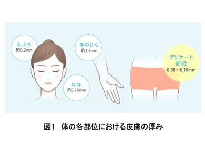 近年、デリケート部位のにおいや乾燥、かゆみなどの悩みを解消するため、フェムケア製品への関心が高まっています。一方、デリケート部位は皮膚が非常に薄く(図1)、バリア機能も弱い上、粘膜部位にも隣接していることから、刺激リスクへの十分な配慮が必要とされます。