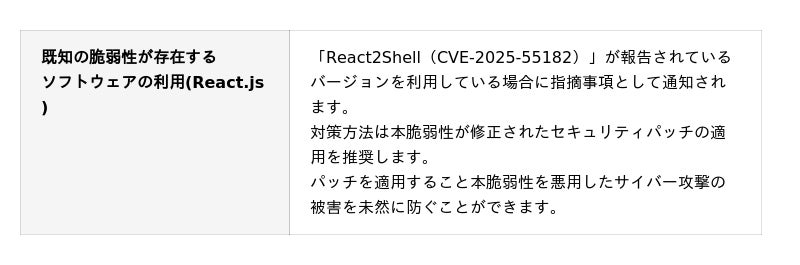 GMOインターネットグループのGMOサイバーセキュリティ byイエラエ株式会社(※1)(代表取締役CEO:牧田 誠 以下、GMOサイバーセキュリティ byイエラエ)は、2025年12月3日、外部公開IT資産を自動で棚卸し・可視化するアタックサーフェスマネジメント(※2)(Attack Surface Management、ASM)ツール「GMOサイバー攻撃 ネットde診断 ASM」をアップデートし、JavaScriptライブラリ「React.js」に存在する深刻なリモートコード実行の脆弱性「React2Shell(CVE-2025-55182)」の検知に対応しました。