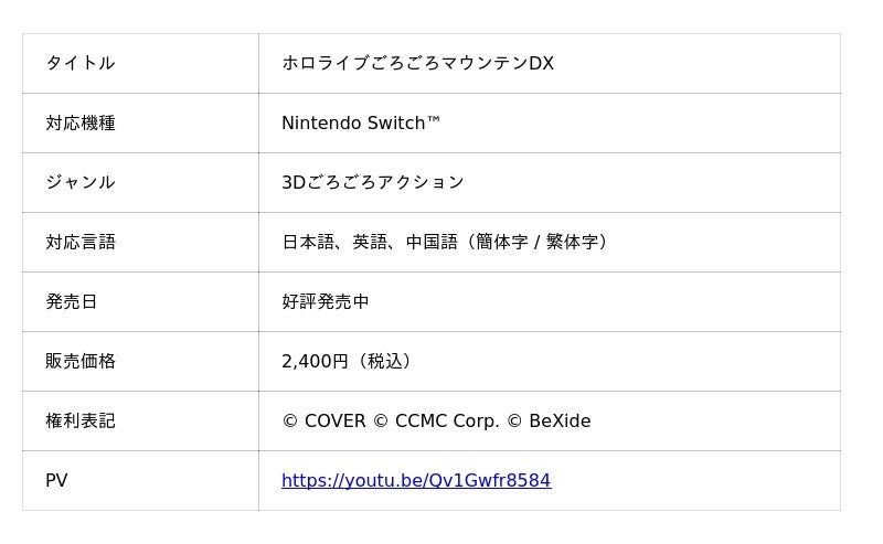 株式会社ビサイド(本社:東京都立川市、代表取締役社長:南治 一徳、以下ビサイド)は、サブブランド「B-SiDE」として開発し、ホロライブプロダクションが提供する二次創作ゲームブランド「holo Indie」にてリリースされるNintendo Switch(TM)︎タイトル『ホロライブごろごろマウンテンDX』が、本日12月18日に販売開始したことをお知らせいたします。