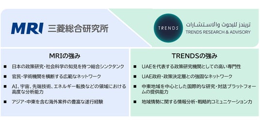 こうした背景を受け、MRIは日本のシンクタンク・コンサルティングファームとして、UAEを拠点とするグローバルな民間・独立系シンクタンクであるTRENDSとの連携を通じ、中東地域における知的ネットワークの強化と政策・技術分野での協力促進を目的に、MOUを締結しました。
