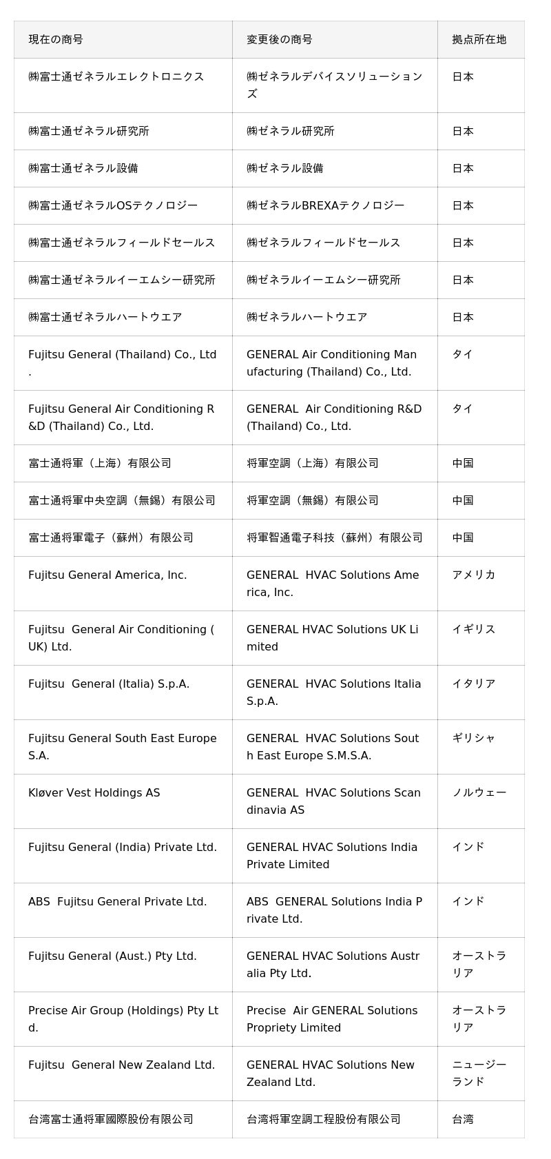 当社は、本年10月1日に公表のとおり2026年1月1日付で商号を「株式会社ゼネラル(英文表記:GENERAL Inc.)」へ改称します。これに伴い、以下の国内外の連結子会社の商号も同日に変更します。
