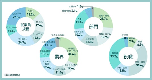 「BOXIL」の会員は部長・課長以上の役職者が約半数を占めています。また、従業員規模1,000名以上の大企業に所属している会員が22.8%、業界では、IT/通信/インターネットが31.4%を占めています。
