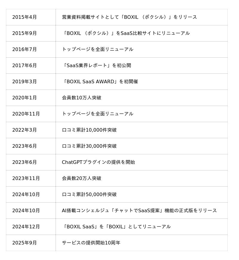 2015年にサービス提供を開始した「BOXIL」は、SaaSを必要とする全てのユーザーと、提供する全てのSaaS事業者にとって最適な出会いの場を創造するために、SaaS業界の成長に伴い、10年間成長を続けてきました。