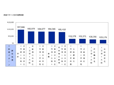 大阪・関西万博来場に伴う周遊先と消費総額について、居住地域と大阪・関西万博会場周辺地域への周遊実績の組み合わせを9パターンに分けて分析した。その結果、「居住地域が近畿圏以外×万博+大阪+京都」(97,946円)が最も高く、次いで「居住地域が近畿圏以外×万博+大阪」(85,979円)、「居住地域が近畿圏以外×万博+その他」(84,677円)が続いた。遠方からの来場者が大阪・関西万博訪問に加えて複数地域を周遊するパターン、特に京都との組み合わせが、消費総額を大きく押し上げる傾向があったことを示している。