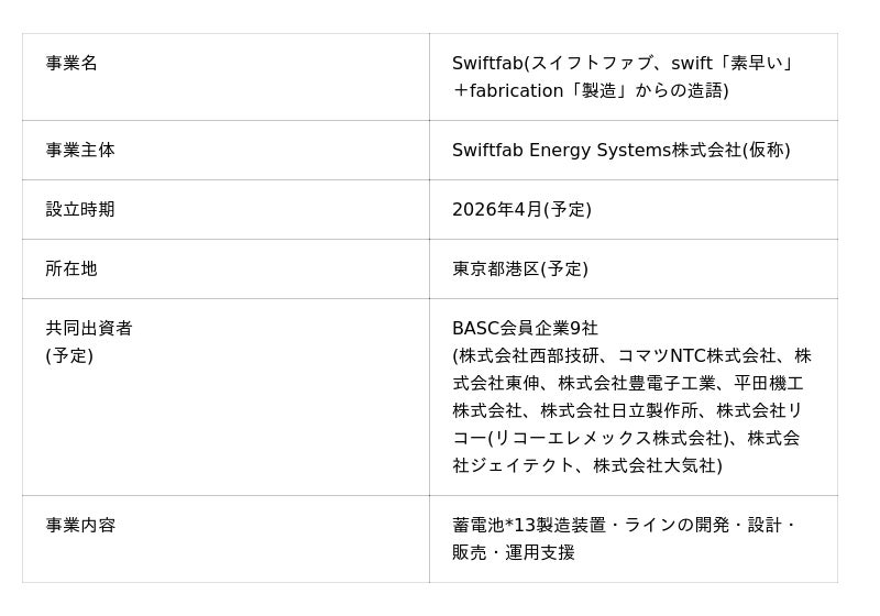 一般社団法人電池サプライチェーン協議会*1(Battery Association for Supply Chain、以下「BASC」)に加盟する設備関連企業の中の9社が、このたび、蓄電池製造設備産業の強化に向け、共同事業体「Swiftfab Energy Systems 株式会社(仮称、以下「当共同事業体」)」の設立に合意しました。当共同事業体は、産業横断型の共同プロジェクト「Swiftfab(以下「本事業」)」を推進するために設立されるものです。蓄電池産業における7つの重点課題*2の1つである「2.電池設備産業の構造変革」に向けて、日本の蓄電池産業の国際競争力向上をめざします。