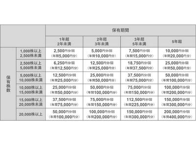 初回は、2025年12月末時点の当社株主名簿に記載又は記録された1,000株以上を1年以上保有されている株主様を対象といたします。進呈額については保有株数及び継続保有期間に応じて実施いたします。なお、継続保有期間につきましては、2020年12月末日まで遡り算出いたします。