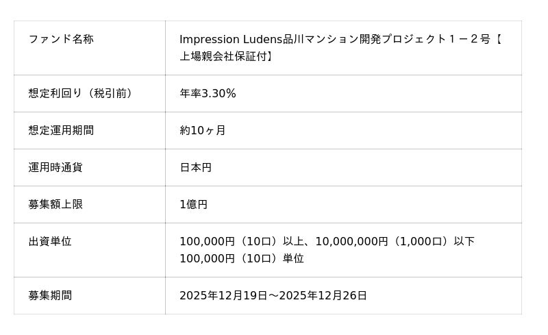 「未来をわかちあう投資」を提供する「Funvest(ファンベスト)」(以下、Funvest)は、「Impression 品川マンション開発プロジェクト1-2号【上場親会社保証付】」(以下、本ファンド)の募集を12/19より開始しますので、お知らせいたします。
