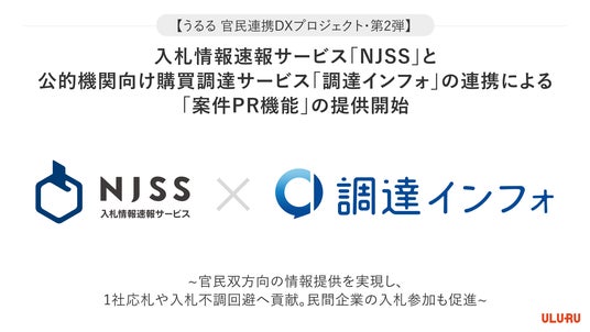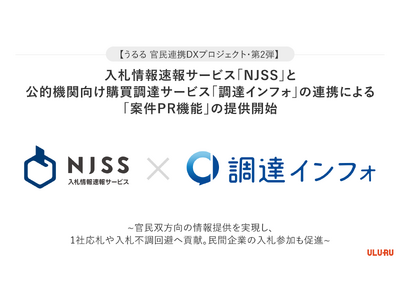 労働力不足問題解決のリーディングカンパニーとして、複数のSaaSを展開する株式会社うるる(東京都中央区 代表取締役社長CEO:星 知也、以下「うるる」)はこの度、民間企業向けの入札情報速報サービス「NJSS(エヌジェス)」と、官公庁・自治体・独立行政法人向け購買調達サービス「調達インフォ」の連携による新たな機能として、公的機関側が民間企業に対して公共入札案件のPRが可能となる「案件PR機能」を提供開始します。