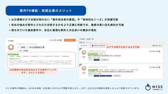 ※なおこの案件PR機能は、NJSSの会員・非会員にかかわらず閲覧可能となり、公平・公正な公共調達を阻害しないよう配慮されています。