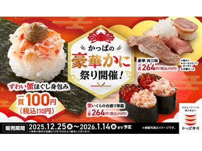 コロワイドグループのかっぱ寿司(カッパ・クリエイト(株) 本社:神奈川県横浜市、代表取締役社長 山角 豪)は、2025年12月25日(木)~2026年1月14日(水)の期間、「かっぱの豪華かに祭り」をかっぱ寿司全店にて開催いたします。