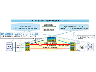 大学共同利用機関法人 情報・システム研究機構 国立情報学研究所(本所:東京都千代田区、所長:黒橋 禎夫、以下「NII」)、NTT株式会社(本社:東京都千代田区、代表取締役社長:島田 明、以下「NTT」)、NTT東日本株式会社(本社:東京都新宿区、代表取締役社長:澁谷 直樹、以下「NTT東日本」)は、激甚災害時のネットワーク維持を想定し、通信状況に応じて光伝送レイヤの設計・制御を自動化することで、波長変換を含む光波長パスにおける経路切替やオンデマンド追加設定を短時間で実現する技術の実証に、世界で初めて成功しました。本成果により、迅速な光波長パスの経路切替・追加提供が可能となり、先端技術研究を支える高信頼な通信基盤の実現と、その利便性の向上が期待されます。