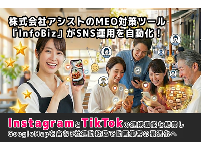 株式会社アシストは、MEO対策ツール『InfoBiz』にInstagramとTikTokの連動機能を搭載。Instagramへの投稿を他媒体へ自動連動させ、運用工数の削減と動画集客を強力に支援します。