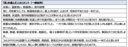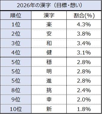 2026年への目標や想いを表す漢字として、昨年に続き2年連続1位となった「楽」。この漢字は「たのしい」と「らく」の二つの読みと意味を併せ持っており、1.明るく充実した1年を“楽しみたい”前向きさと、2.心身・経済的負担を“ラク”にしたい切実さの双方を同時に表現できる漢字であると言えます。コロナ禍や物価高など“重い”数年を経験したからこそ、来年こそは「明るさ」と「ゆとり」の両方を取り戻す1年にしたいという切実な思いが、「楽」を選んだ方のコメントからも読み取れます。【表2】