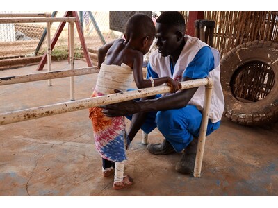 やけどを負った子どもが再び歩けるようケアにあたる理学療法士(南スーダン北西部・アウェイル)=2025年3月5日 (C) Frederic Seguin/MSF