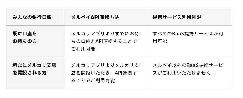 メルカリバンクはすべてのみんなの銀行口座でご利用いただくことが可能です。既にみんなの銀行口座をお持ちの方は、メルカリアプリからメルペイとのAPI連携を行うことで登録が完了します。みんなの銀行口座をお持ちでない方はメルカリアプリからみんなの銀行Webブラウザに遷移し「メルカリ支店」を開設後、API連携を行うことで登録が完了します。なお、メルカリ支店は、他の「BaaS提携サービス*⁶」とのAPI連携ができませんのでご注意ください。