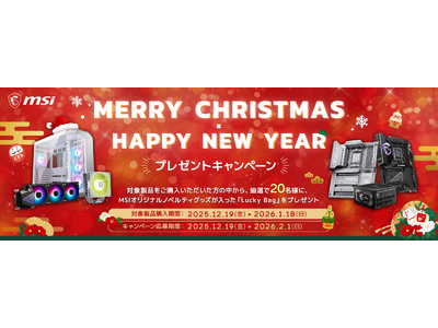 この度、エムエスアイコンピュータージャパン株式会社は、2025/12/19(金)~2026/2/1(日)の期間中、「Merry Christmas & Happy New Yearプレゼントキャンペーン」を開催いたします。対象製品を購入し応募していただいた方の中から抽選で20名様に、MSIオリジナルノベルティグッズが入った「Lucky Bag」 をプレゼントいたします。