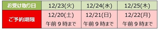 チキンおよびチキンセットはご予約がなくてもお求めいただけますが、お受け取り日の3日前午前9時までにご予約いただくと、時間を指定して店頭のお受け取りが可能です。