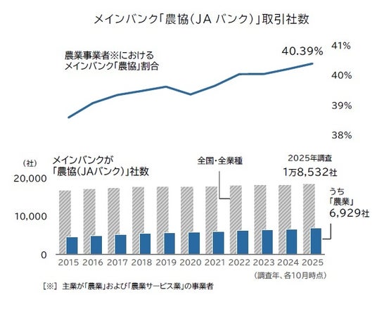近時は、農業を営む事業者が農協をメインバンクとする割合が再び高まっている。全国の農業事業者1.7万社のうち、「農協」をメインバンクとする事業者は40.39%だった。2021年まで40%を下回る水準で推移するなど、金融機能を農協に求める動きが長く停滞傾向にあったなか、2022年は初の40%台に到達、2025年は前年に続き2年連続で農業全体でのシェアを拡大させ、最高を更新するなど、農業分野で金融仲介機能としての存在感を高めている。