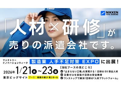 多様な人材を人的資本と捉え、人材ソリューションで可能性を創造する「人的資本創造企業」の日研トータルソーシング株式会社(本社:東京都大田区)は、1月21日(水)~23日(金)に東京ビッグサイトで開催される「第1回 製造業 人手不足対策EXPO(東京)-人材の採用・教育・管理展-」に出展いたします。