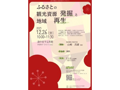福井県あわら市は12月26日(金)、地域の魅力を再発見し、観光振興や地域再生につなげる市民大学講座「ふるさとの観光資源発掘と地域再生」を開催します。講師には、文化観光やアートマネジメント等を研究する関西国際大学経営学部の山崎茂雄教授を招き、地域の魅力発見や振興につながる事例をもとに、地元資源を活かすヒントを学びます。