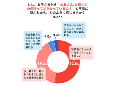 「もし子どもから『保険どうなってるの?』と聞かれたらどう感じるか」という問いに対し、「話す良いきっかけになるので、むしろ嬉しい」(52.8%)、「きちんと話そうと思う」(39.2%)を合わせ、