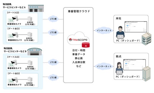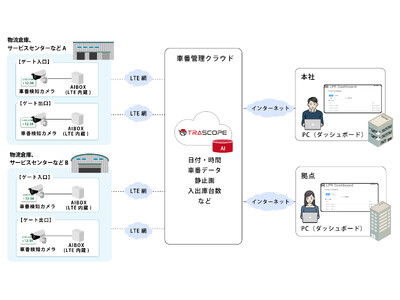 カメラ方式のため、車載器の有無にかかわらずスポット協力会社を含む「全来場車両」を一律に把握でき、将来的には予約システムや入退場管理、計量システムとの連携によるボトルネックの可視化や、未予約車両の検知・自動誘導などへの拡張も可能です。また、AIBOXにLTEを内蔵していることで、現場のLAN配線工事が必要とせず、コストを抑制します。既存システムにはAPIを使用したデータ送信(オプション機能)を使用することで、連携を実現します。