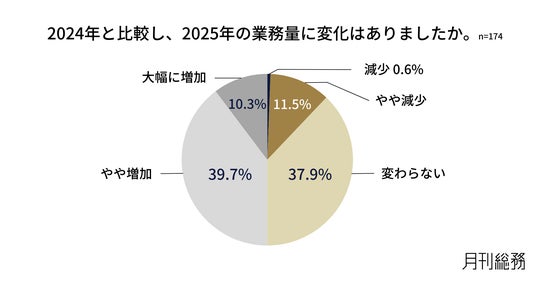 2024年の業務量と比較して、2025年の業務量に変化があったか尋ねたところ、37.9%が「変わらない」、39.7%が「やや増加」、10.3%が「大幅に増加」と回答しました(n=174)。