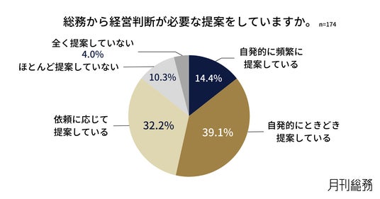 総務から経営判断が必要な提案をしているか尋ねたところ、53.5%が自発的な提案を行っていると回答しました。「全く提案していない」は4%にとどまり、9割以上の総務が何かしら経営判断が必要な提案を行っていることがわかりました(n=174)。