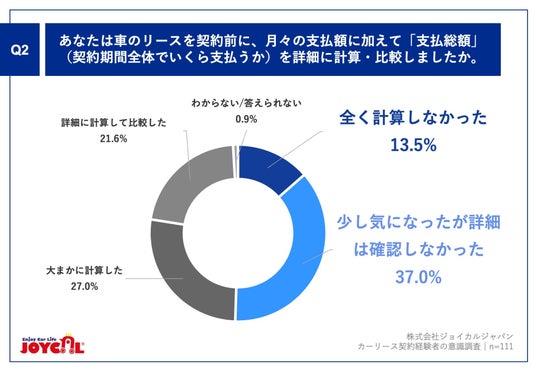 当社が2025年7月にカーリース契約経験者111名を対象に行った調査では、契約前に月々の支払額に加えて支払総額をどの程度計算・比較したかを尋ねたところ、「全く計算しなかった」「少し気になったが詳細は確認しなかった」が合わせて50.5%に達しました。