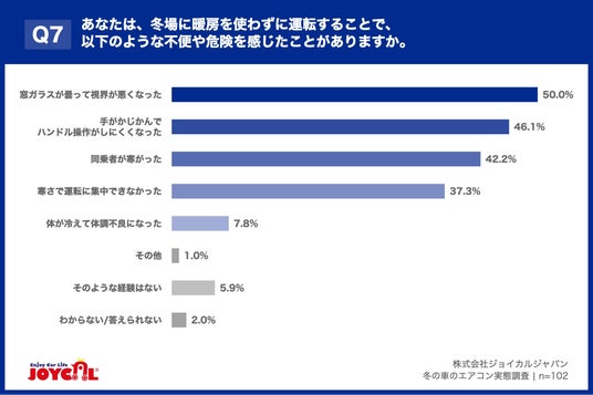 約7割が寒さを我慢して暖房を控えた経験があり、その結果「窓ガラスの曇りによる視界不良」(50.0%)や「手のかじかみによるハンドル操作困難」(46.1%)といった安全上の問題が生じている実態も見えました。