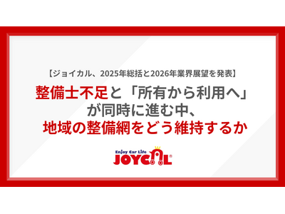 株式会社ジョイカルジャパン(本社:東京都千代田区/代表取締役社長 CEO 早川 由紀夫、以下:ジョイカル)は、2025年の自動車整備業界の動向を整理するとともに、2026年に向けた業界展望を発表いたしました。