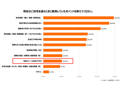 「家が狭い」と感じている人に、現在の家を選ぶときに重視したポイントについて聞いたところ、最も多かったのは「住宅費用」(39.4%)、次いで「最寄り駅からの徒歩距離が近い」(36.8%)、「勤務先や学校へのアクセスが良い」(32.0%)となりました。 一方で、「収納スペースの使いやすさ」を重視した人は10.4%に留まり、家を選ぶ段階では「コスト」や「立地」を優先する傾向があることがわかりました。