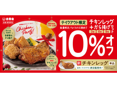 株式会社吉野家(本社:東京都中央区、代表取締役社長:成瀬哲也)は、12月19日(金)11時から期間限定で、全国の吉野家から揚げ販売店舗にて、期間限定で「チキンレッグ」を販売開始します。本商品は、クリスマスの定番である骨付きチキンで、ブラックペッパーが食欲をそそるこんがり焼き上げた商品です。「チキンレッグ」単品での販売は、店内・テイクアウトでご利用いただけます。また、テイクアウト限定で「チキンレッグ」と「から揚げ」がついた商品を10%オフでご提供します。ご家庭でのクリスマスパーティーはもちろん、職場や外出先でも気軽に楽しんでいただけるセットとなっています。