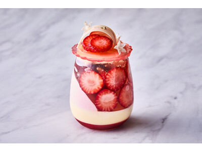フレッシュな苺やムースなど、一番美味しくなる時期の苺をたっぷりと使ったスイーツです。中には、苺の味を引き立てる柔らかな甘みとレモンの酸味が合わさった“はちみつとレモンのゼリー”と、紅茶の豊かな風味と軽い苦みがアクセントになった“紅茶のゼリー”が入っています。下層のほのかな甘さが苺と相性のよい“マスカルポーネムース”と、甘酸っぱい“木苺のソース”が、最後まで飽きさせず全体をさっぱりとした味わいにまとめています。華やかで可愛らしい見た目も楽しい逸品です。