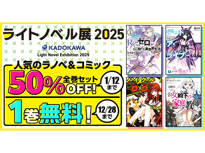https://animestore.docomo.ne.jp/ )では、12月28日(日)までSHIBUYA TSUTAYAにて行われる「ライトノベル展 2025」の開催を記念して、人気ライトノベル&コミックの全巻セットが50%OFFで購入できるキャンペーンを開催中です。さらに、23作品(ラノベ・コミック)の1巻無料試し読みや、著者サイン本など豪華プレゼントも!「ライトノベル展 2025」×dアニメストアの特別なコラボレーションで、年末年始は思い切りラノベ&コミックを楽しんでください!