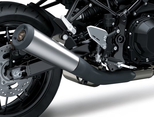 燃料タンクには、カワサキの伝説的モデル「マッハシリーズ」へのオマージュとしてレインボーラインのグラフィックを採用。KAWASAKIロゴは転写フィルムで表現され、下地のボディカラーが透けることで独自の存在感を放ちます。サイドカバーのエンブレムもブラック仕上げとし、全体の統一感を高めています。