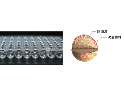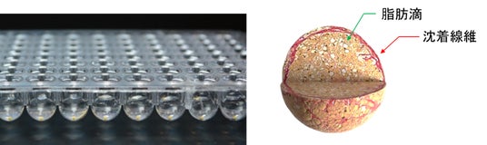 図1 「ヒト3Dミニ肝臓(R)/疾患モデル」の製品外観(96ウェルプレート入り;左)と模式図(右)