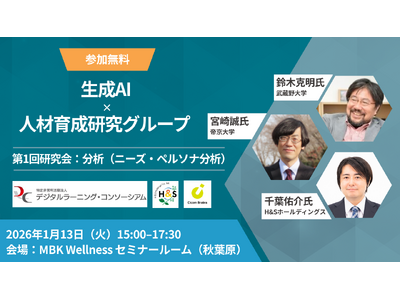 国内外で企業の人材育成を支援するMBK Wellness 株式会社 サイコム・ブレインズ事業本部(東京都千代田区、事業本部長 勝 幹子)は、2026年1月、特定非営利活動法人デジタルラーニング・コンソーシアム(DLC)および 、H&Sホールディングス株式会社と連携し、「生成AI×人材育成研究グループ」を発足いたします。