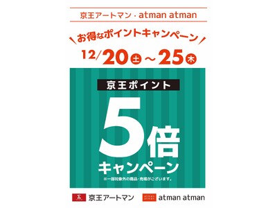 京王グループでコスメを中心に生活雑貨を販売する株式会社京王アートマン(本社:東京都多摩市、以下 京王アートマン)は、2025年12月20日(土)から2025年12月25日(木)まで京王アートマン・アートマン アートマン 全店にて「京王ポイント5倍キャンペーン」を開催いたします。