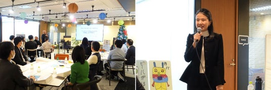 <左>マルチステークホルダーダイアログの様子、<右>本会に際し挨拶を行うネオキャリア執行役員・國澤