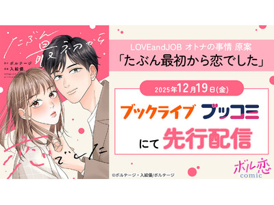 株式会社ボルテージ(本社:東京都渋谷区 代表取締役:津谷 祐司)は、オトナ女子向けオリジナルコミックレーベル「ボル恋comic」にてボル恋タイトル「100シーンの恋+」内で配信中の「LOVE&JOBオトナの事情」を原案としたコミカライズ作品「たぶん最初から恋でした」を、12月19日(金)株式会社BookLive(本社:東京都港区 代表取締役社長:淡野 正)が運営する、国内最大級の電子書籍ストア「ブックライブ」および「ブッコミ」にて先行配信したことをお知らせいたします。