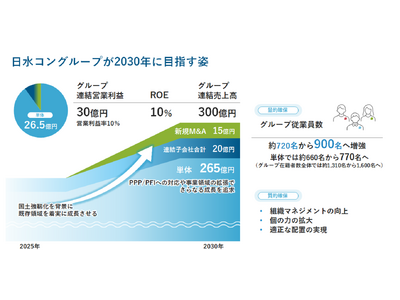 株式会社日水コン(本社:東京都新宿区、代表取締役社長:中西 新二)は、2026年から2030年を対象とする「日水コングループビジョン2030」の公表に先立ち、下記のとおり、その骨子となる概要版を策定しましたので、お知らせいたします。